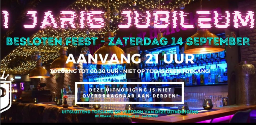 Zaterdag 14 September, het 1 jarig jubileum vieren wij met een besloten feest. Toegang tot 00:30 uur. Na 00:30 UUR GEEN TOEGANG, roken is ook niet meer naar binnen, dit ivm de drukte van de feesttent.